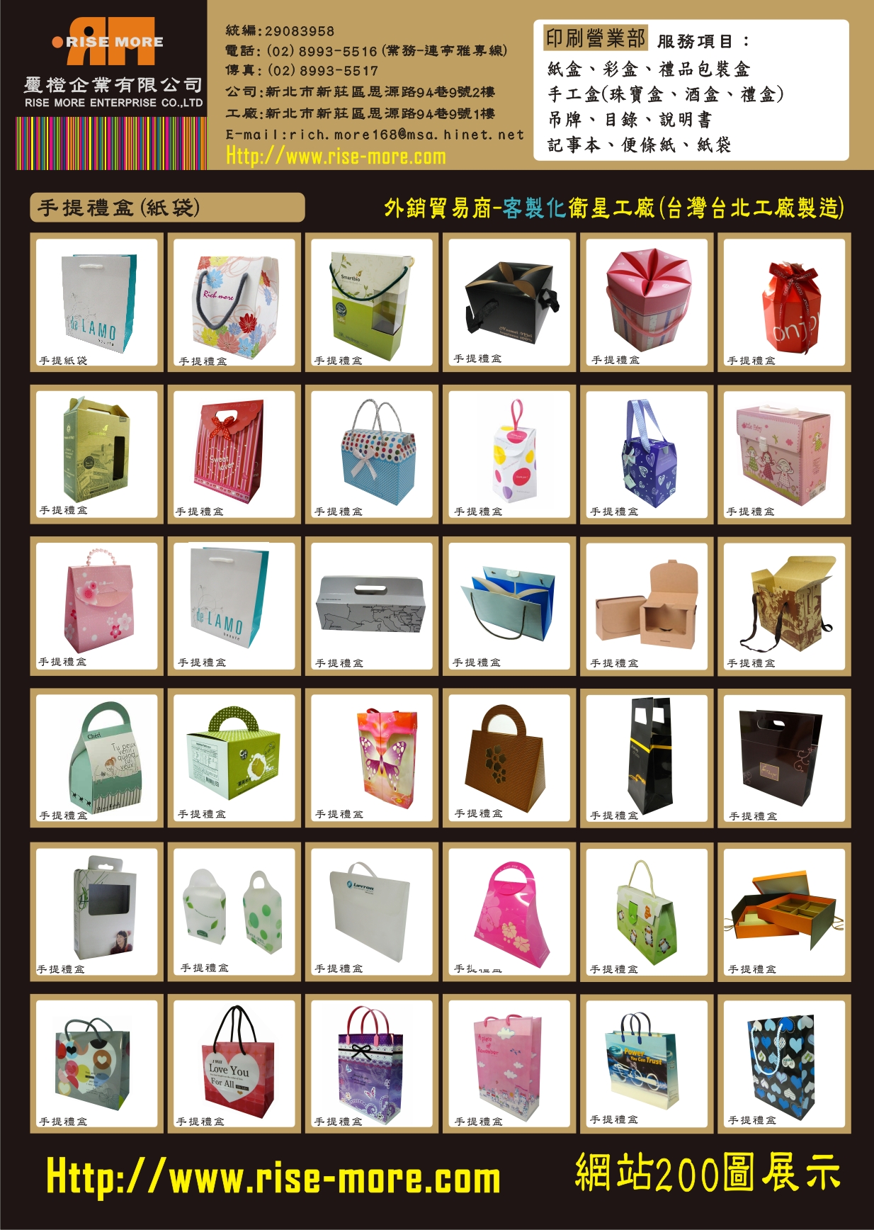 璽橙企業有限公司 - 200圖展示(Http://www.rise-more.com) 紙盒、盒子、禮品包裝盒、彩盒、紙袋、購物袋、廣告促銷贈品、印刷專業製造工廠。